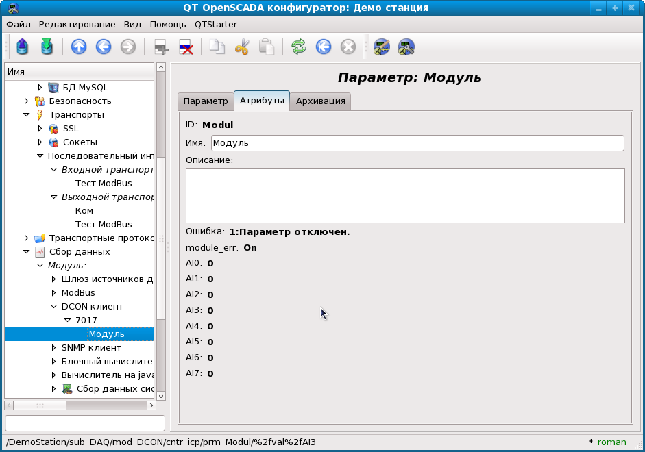 Создал выходной транспорт, в модуле DCON клиент создал контроллер, в контроллере создал параметр и сконфигурировал его на работу с моим устройством. Получаю на вкладке атрибуты страницы параметра --- Ошибка: 1:Параметр отключен module_err:On AI0..AI7:0.