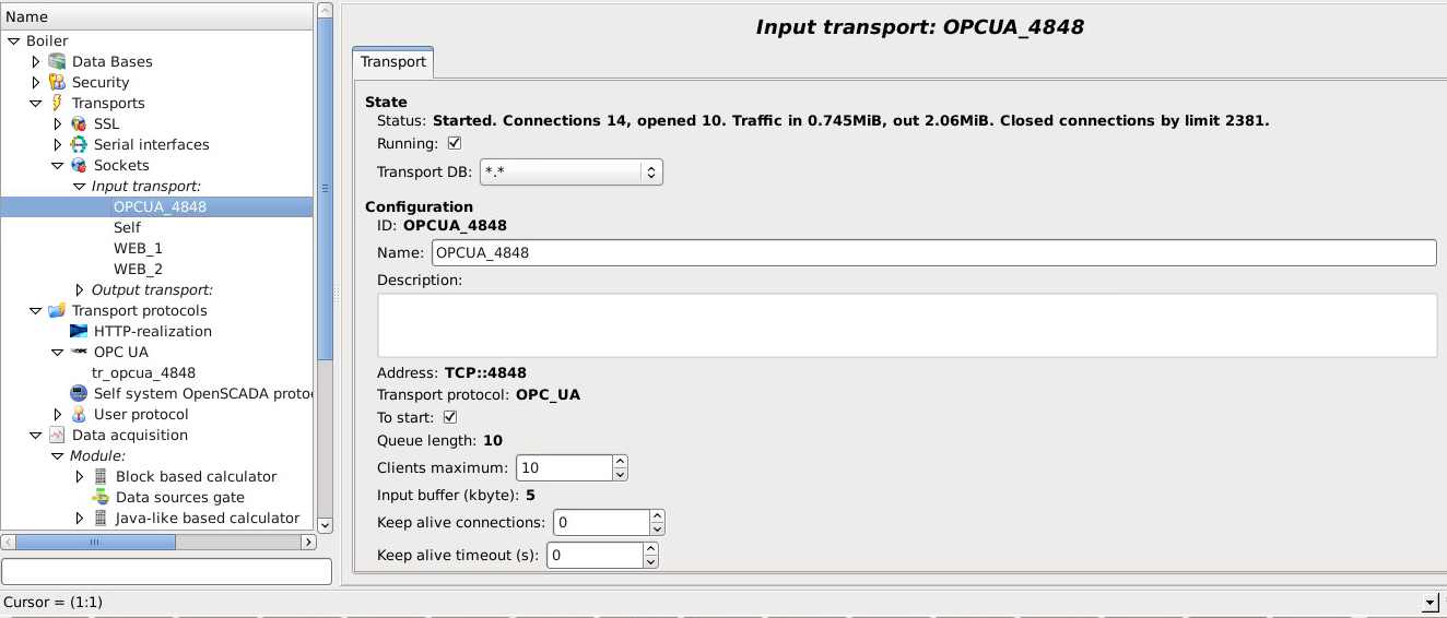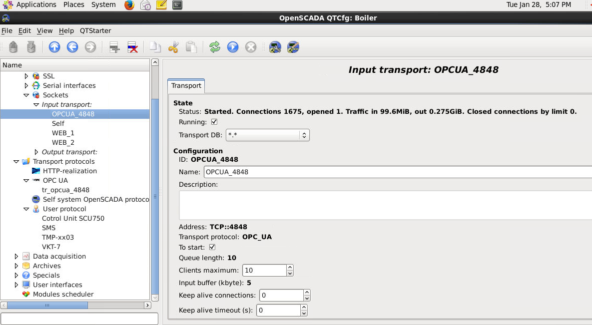 Подключил UAexpert и OpenSCADA OPC UA controller к серверу OPC UA в OpenSCADA. Затем в запущенном транспорте поиграл скролом - изменил тип протокола с OPC UA на пустое поле.