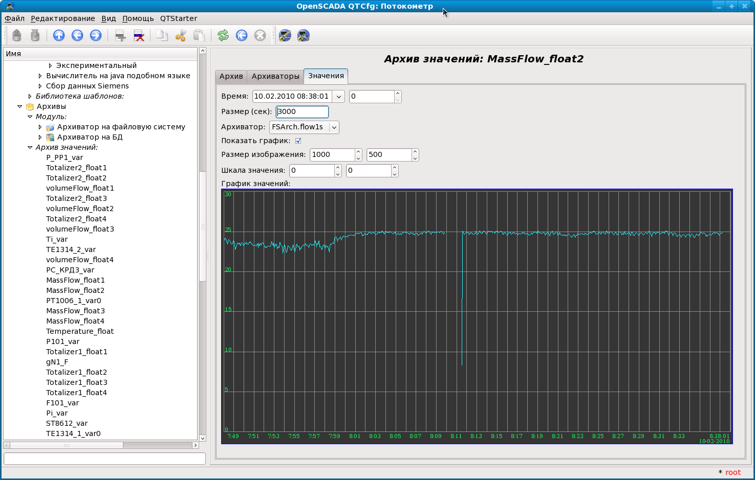 Построение системы получения данных следующее: в модуле модбас для расходомера создан контроллер, каждый параметр это параметр расходомера, например плотность, получаю значения параметров двумя двухбайтными переменными, потом передаю их в модуль логического уровня, где через шаблон получаю вещественное значение, полученное вещественное значение архивирую.
