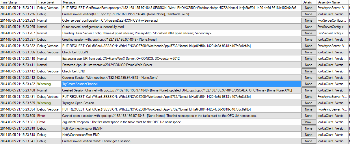 <record level="800" timestamp="2014-03-05T16:52:54.859" processID="6532" threadID="86" file="Unknown" lineNo="0" SeqNo="919666" colNo="0" processName="C:\Program Files\ICONICS\GENESIS64\Components\IcoFwxServer.exe" threadName="Session Worker: opc.tcp://192.168.195.97:4848 - [None:None]" appDomainID="50081034" appDomainName="IcoFwxServer.exe" assemblyName="IcoUaClient, Version=10.80.118.0, Culture=neutral, PublicKeyToken=58aa7495915e8ed4" assemblyCodebase="file:///c:/program files/ICONICS/genesis64/components/IcoUaClient.DLL" namespace="Ico.Fwx.Ua.Client" class="UaClientSession" method="a(String A_0, PasswordCache A_1, Boolean A_2, String&amp; A_3)">