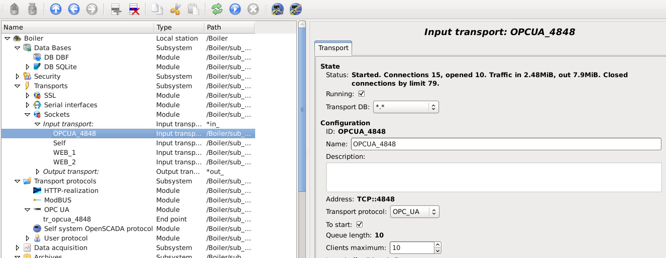 Для входящего транспорта OPC UA статус такой Started. Connections 25, opened 10. Traffic in 0.912MiB, out 1.58MiB. Closed connections by limit 155.