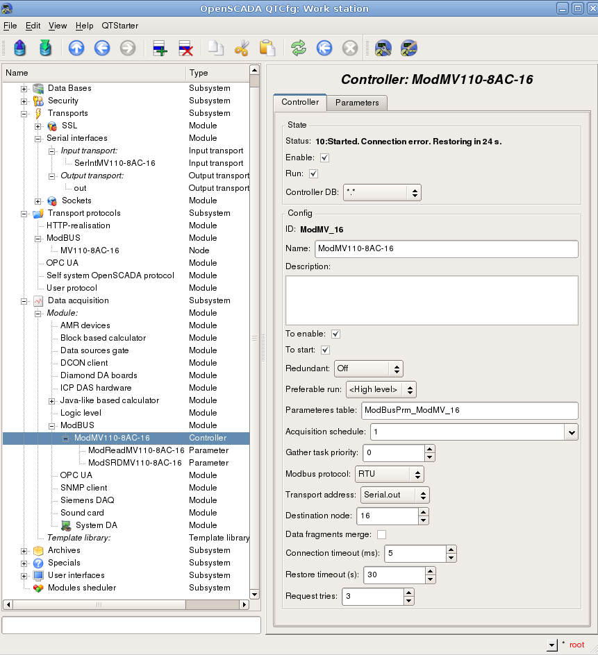 Возникла проблема подключения овен МВ110-8АС к openscada по протоколу modbus RTU (сеть rs485).