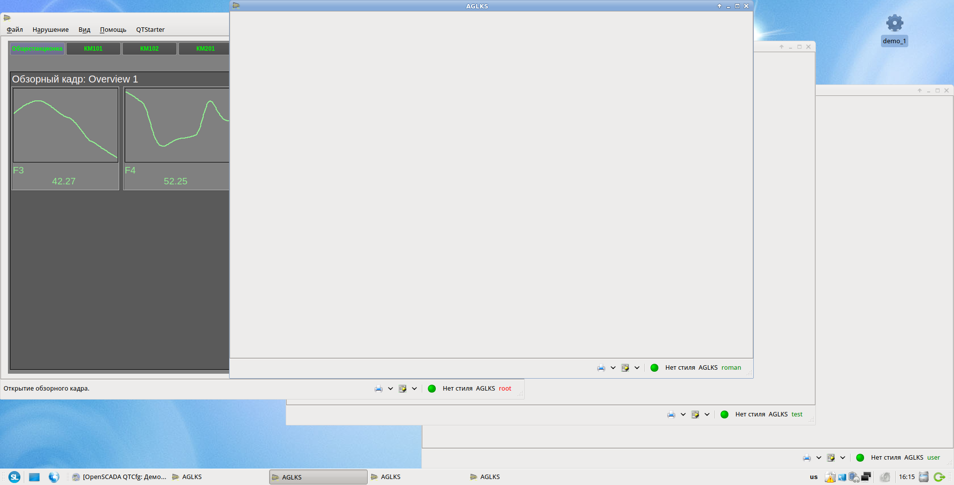 Запускаем на нескольких удаленных машинах (или несколько проектов локально - результат тот же) openscada, соединяемся с демо-станцией по self-протоколу и запускаем проект визуализации АГЛКС под разными пользователями на каждой машине.