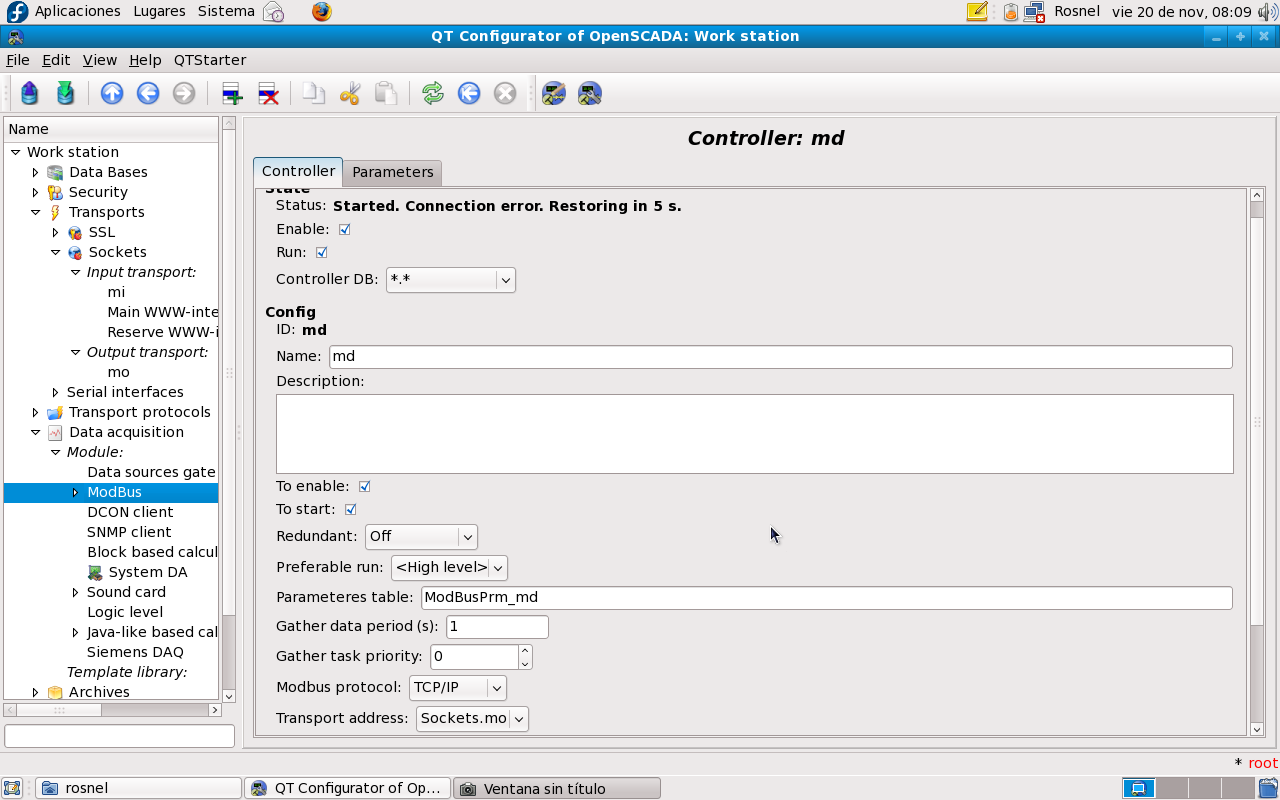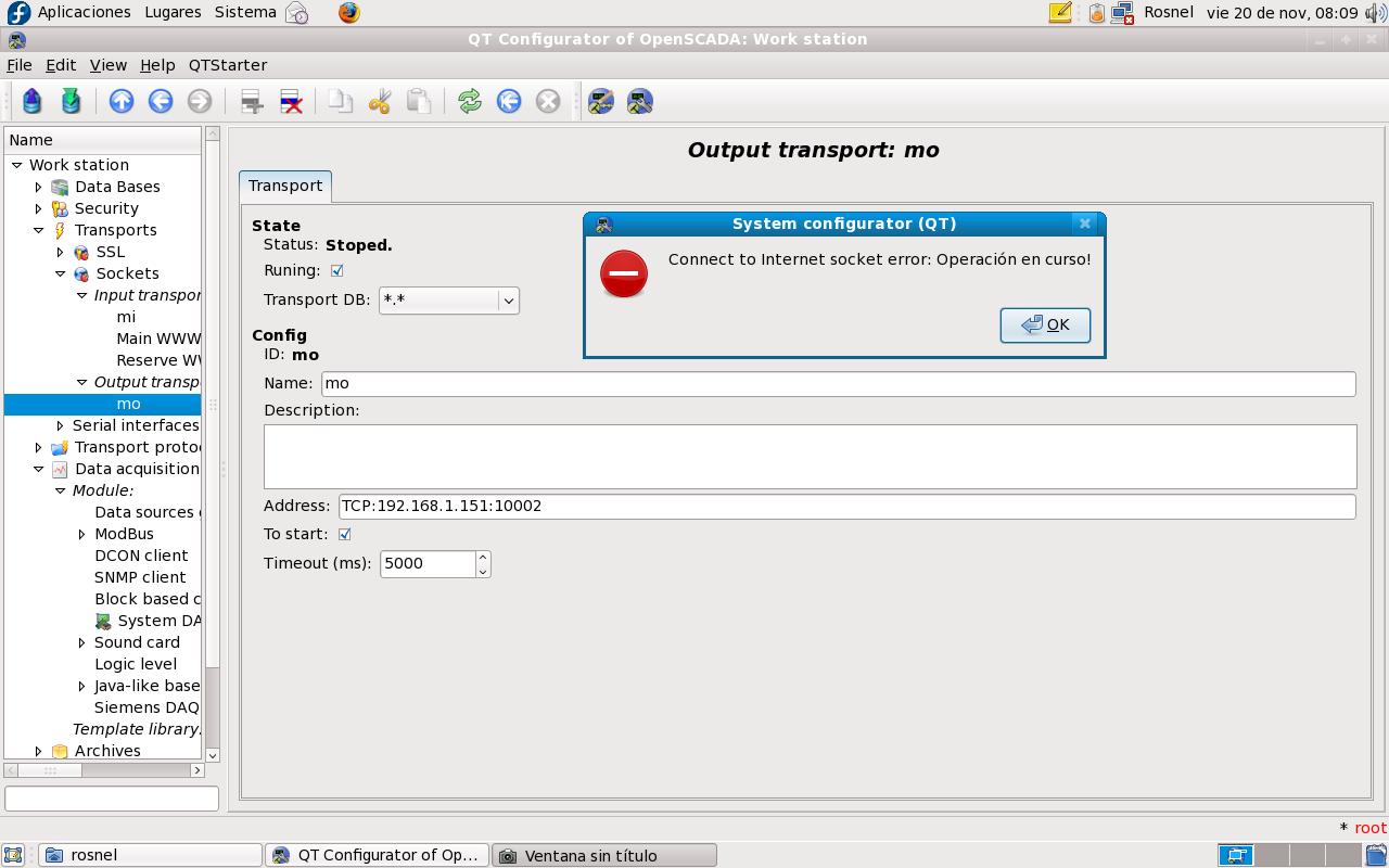I'm trying to test the Modbus protocol, and when I connect a device and configure the "socket" for input and output module "trasports" failed to establish communication. I do this and then run a "Data Acquisition" module "modbus" using the TCP / IP using the "socket" previously configured.