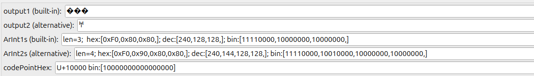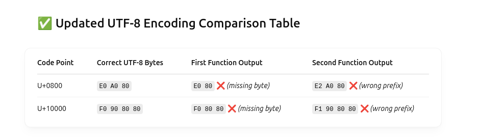old and new functions will fail U+800 and U+10000 tests. length is now determined correctly, but the first byte is different. gpt chat refers to RFC 3629 limits.