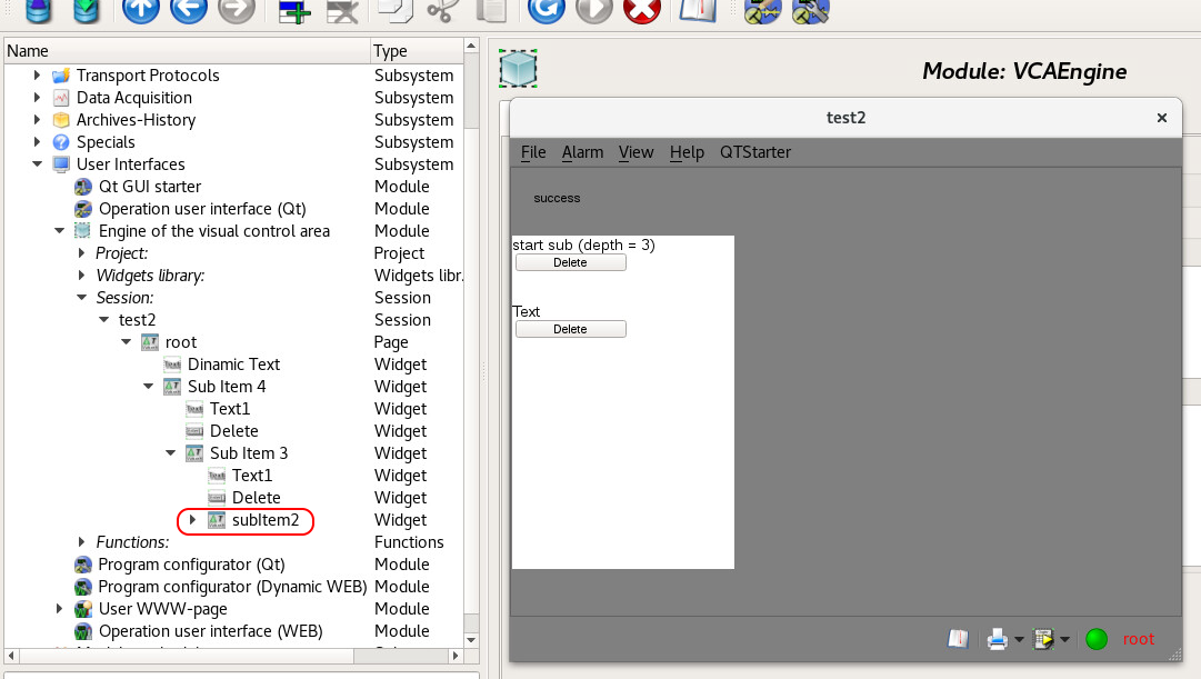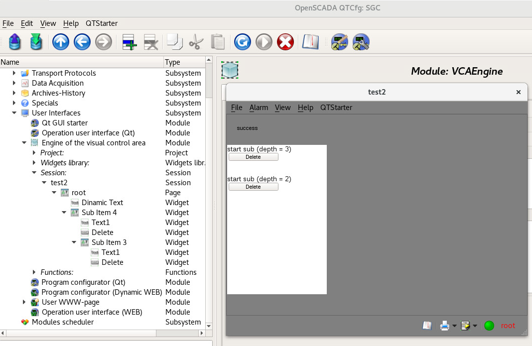 При запуске проекта все прекрасно работает - на странице появляется поле с текстом "success", хотя в графическом конструкторе его не было, то есть объект был добавлен динамически при выполнении кода. И в системном конфигураторе в разделе текущих сессий также можно видеть этот динамически созданный элемент вложенный в корневую страницу (смотри приложенный рисунок 1).