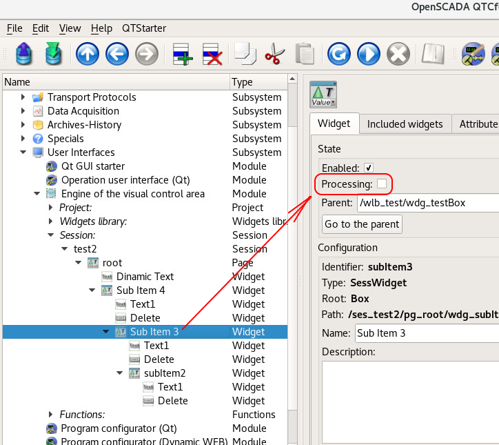 Проблема возникает если попробовать установить значение depth равным 2 или более. Вроде бы при этом должно создаться два элемента /wlb_test/wdg_testBox, при этом один элемент должен быть вложен в другой, но при запуске проекта этого не происходит. При запуске проекта на корневой странице создается первый дочерний элемент /wlb_test/wdg_testBox (смотри приложенный рисунок 4). А в системном конфигураторе в дереве сессий можно видеть, что дочерний объект был создан (смотри приложенный рисунок 5). Но почему то этот объект имеет не установленный флаг Process и часть его атрибутов не была задана скриптом, например Name. И еще одно - при закрытии окна с запущенным проектом визуализации сессия не закрывается и в конфигураторе системы можно видеть, что она продолжает работать и снять ее удается только закрытием всей OpenSCADA.