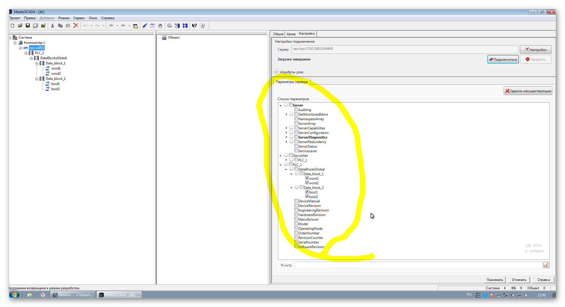 Зеленым подсвечены узлы, которые OpenScada видит, красным, которые не видит, остальные (без подсвечивания) не смотрел, интересует только ветка PLC_1. Видимость узлов проверяю вкладке <Server nodes browser> см. вложение 002.png