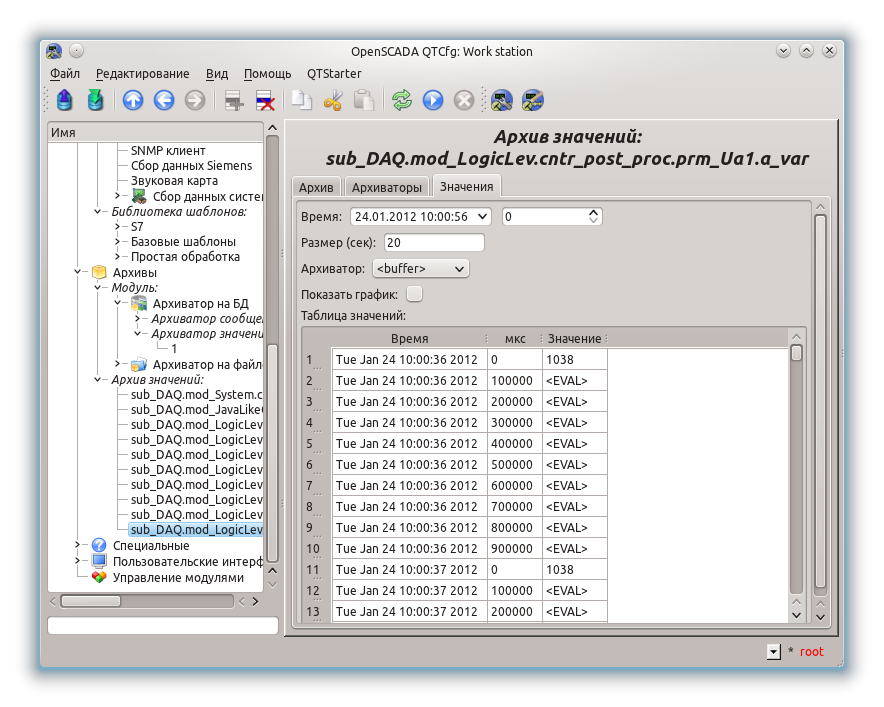 При архивировании значений из контроллера модуля «Сбор данных системы» (при тех же настройках архиватора и архива) удается получить архив с полезными данными с интервалом 0.1 с.