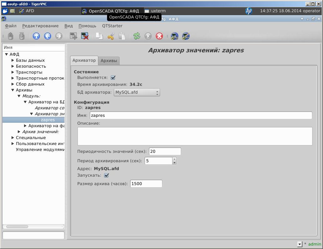 В настройках АРХИВАТОРа ЗНАЧЕНИЙ указал следующее: периодичность значений-10 сек., период архивирования-60 сек. Все заработало, но с периодичностью около минуты OpenSCADA делает вид, что "повисла": не реагирует на нажатие кнопок, не меняется изображение на мониторе и т.д.