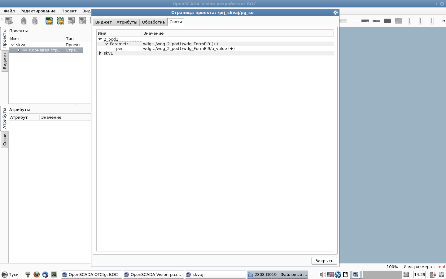 Здравствуйте. Пробовал передать из одного виджета в другой параметр. но результат отрицательный, видно где то еще есть недопонимание. связи везде полные. скада 0.8. последняя, линукс 12.3. В обработке пишу skv1.pereliv = 2_pod1.per результат ошибка.