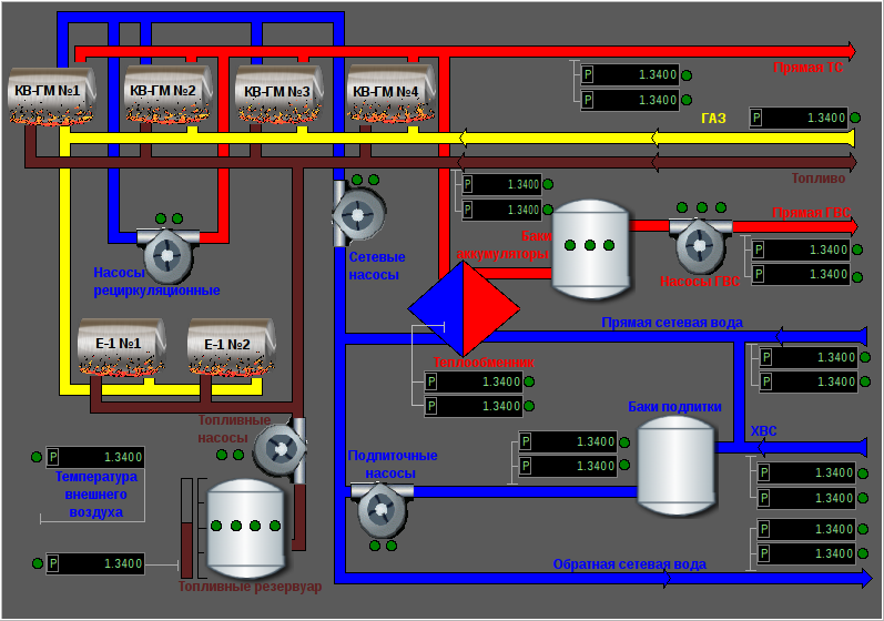 Главная мнемосхема котельной была разработана и реализована с помощью встроенного визуализатора системы OpenSCADA Vision.