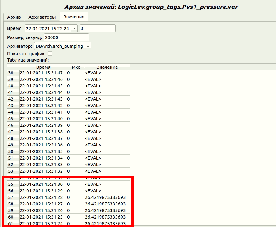 попутно еще вопрос. на скриншотах приведены страницы с описанием архива, о котором речь. если заглянуть в данные в виде таблицы, то последние несколько минут всегда <EVAL>, хотя если включить отображение графика, то видно, что данные есть! как это объяснить? не является ли это причиной неудач вызова SYS.Archive["va_Pvs1_pressure_var"].getVals()?