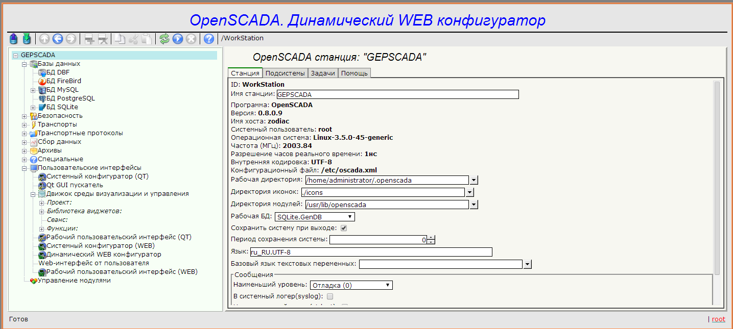 После добавил свои проекты и запустил один из них. При изменении в проекте любых элементов эти же изменения тут же появлялись при просмотре проекта через Web-интерфейс. Но так как после выхода из скады выключается и Web-интерфейс c помощью команд: openscada -daemon, service openscada start - запустил OpenSCADA как сервис. При этом если раньше в Динамическом WEB конфигураторе раньше было написано так: "Конфигурационный файл:/oscada.xml", то после вышеописанных команд стало: "Конфигурационный файл:/etc/oscada.xml". Вместе с этим сменились все настройки, в частности все стало на английском языке.