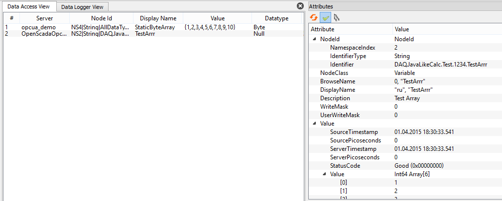 Строка выше - пример как отображаются данные из массива, прочитанного из сервера Unified Automation Demo.