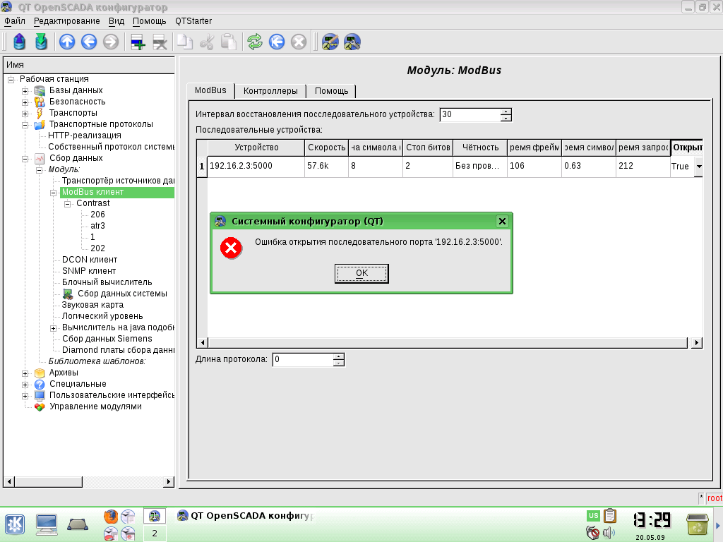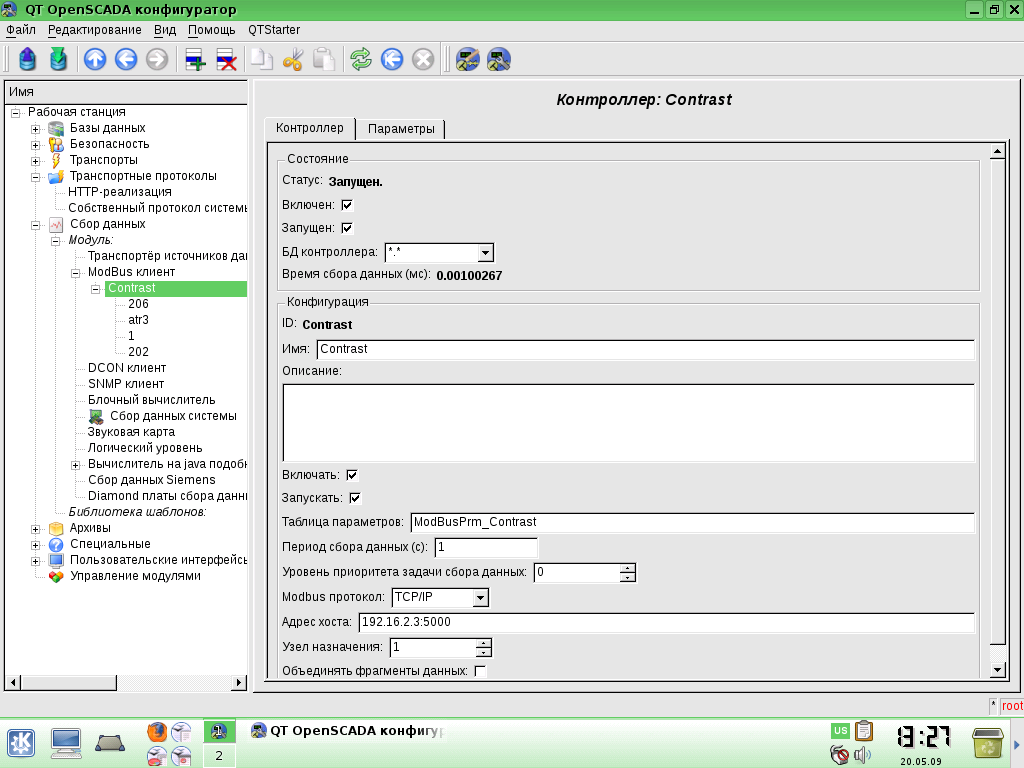 Здравствуйте! Помогите пожалуйста разобраться. Установил контроллер Контраст КР-500, связал его с OpenSCADA по ModBUS протоколу, прописал IP адрес контроллера, поставил галочку запущен - вроде работает. Как мне снять и отобразить хотябы один параметр с него,например у меня к контроллеру подключена термопара, хотелось бы отобразить её значение.