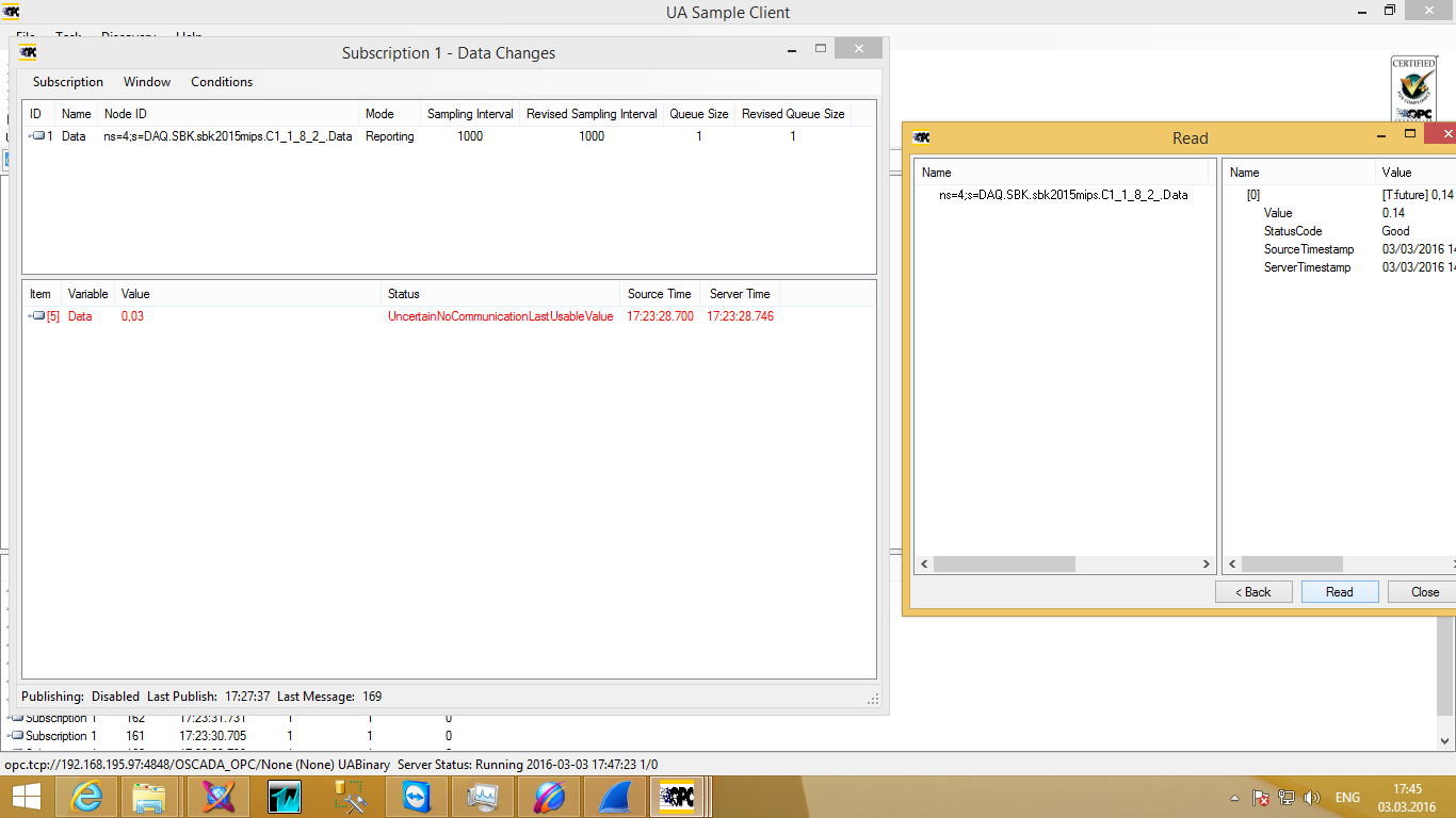 Если же выполнить чтение запросов read, то данные считываются. На скриншоте во вложении явно видно, что один и тот же атрибут узла OPC UA при различных способах чтения имеет два значения. И тот, который имеет неактуальное значение содержит статус "UncertainNoCommunicationLastUsableValue".