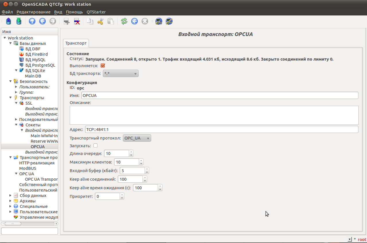 Повторюсь, коннект с UaExpert идет, в окне входного транспорта отображается статистика соединений (см. скриншот), но он нестабильный, рвется через непродолжительное время.
