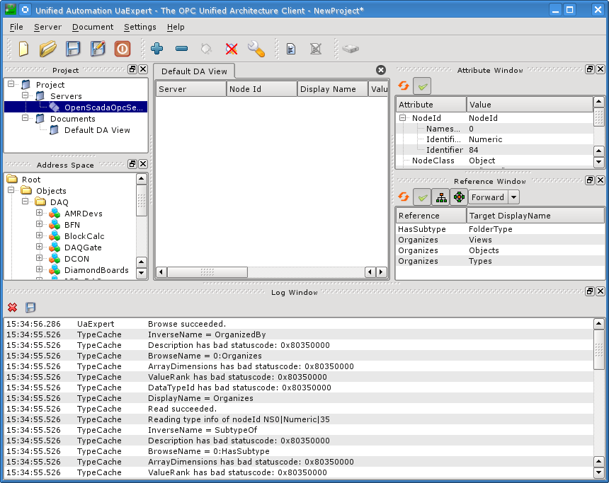 не могли бы вы выложить скриншот UaExpert'a подключенного к OPC UA серверу OpenSCADA, где были бы видны окна лога, Address Sapce и Attribute Window