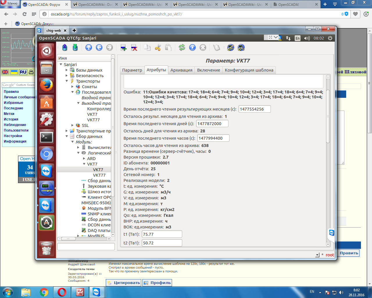 В объекте скады стали видны 4 параметра - уже прорыв :) - Т1 приточки, Т2 обратки, дельта Т, и G1 объем.
