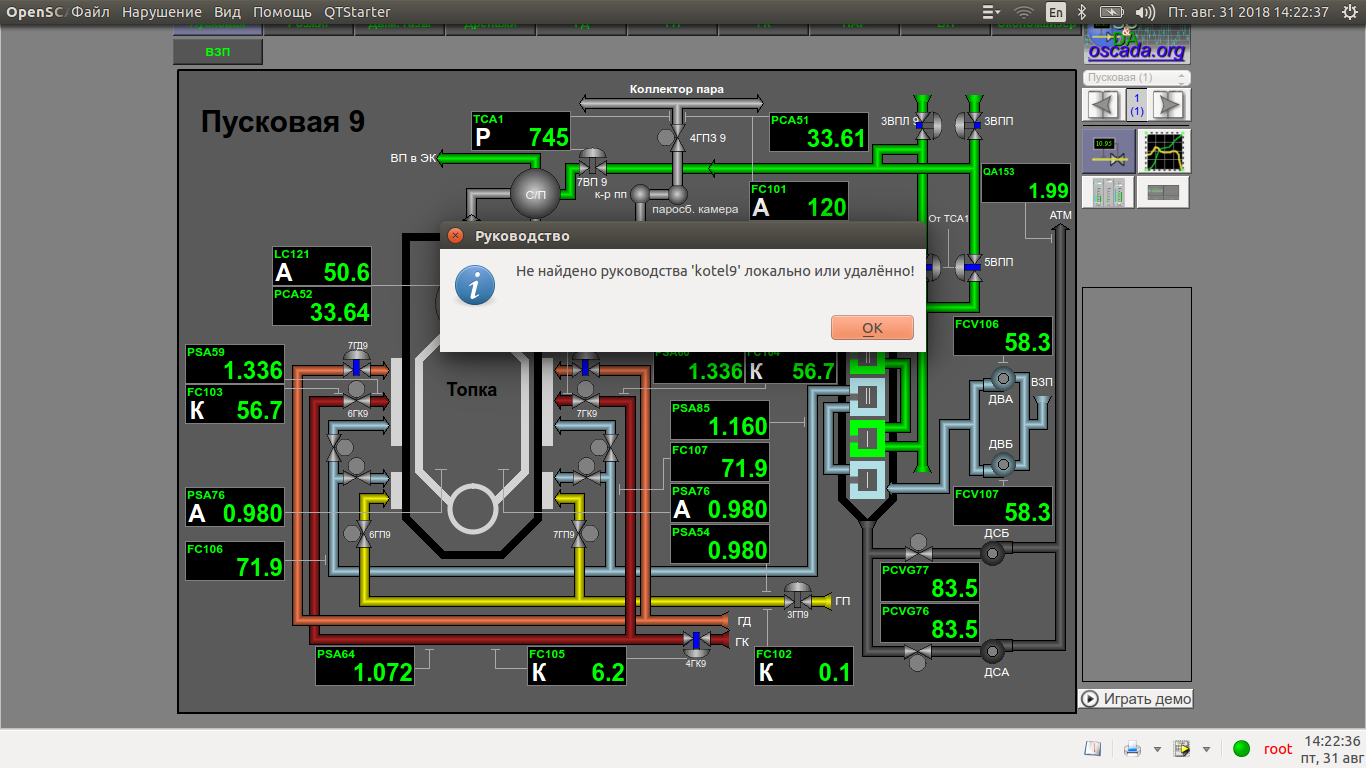 логинишься в скаде root/openscada, далее появляется верхнее меню. QtStarter->Конфигуратор