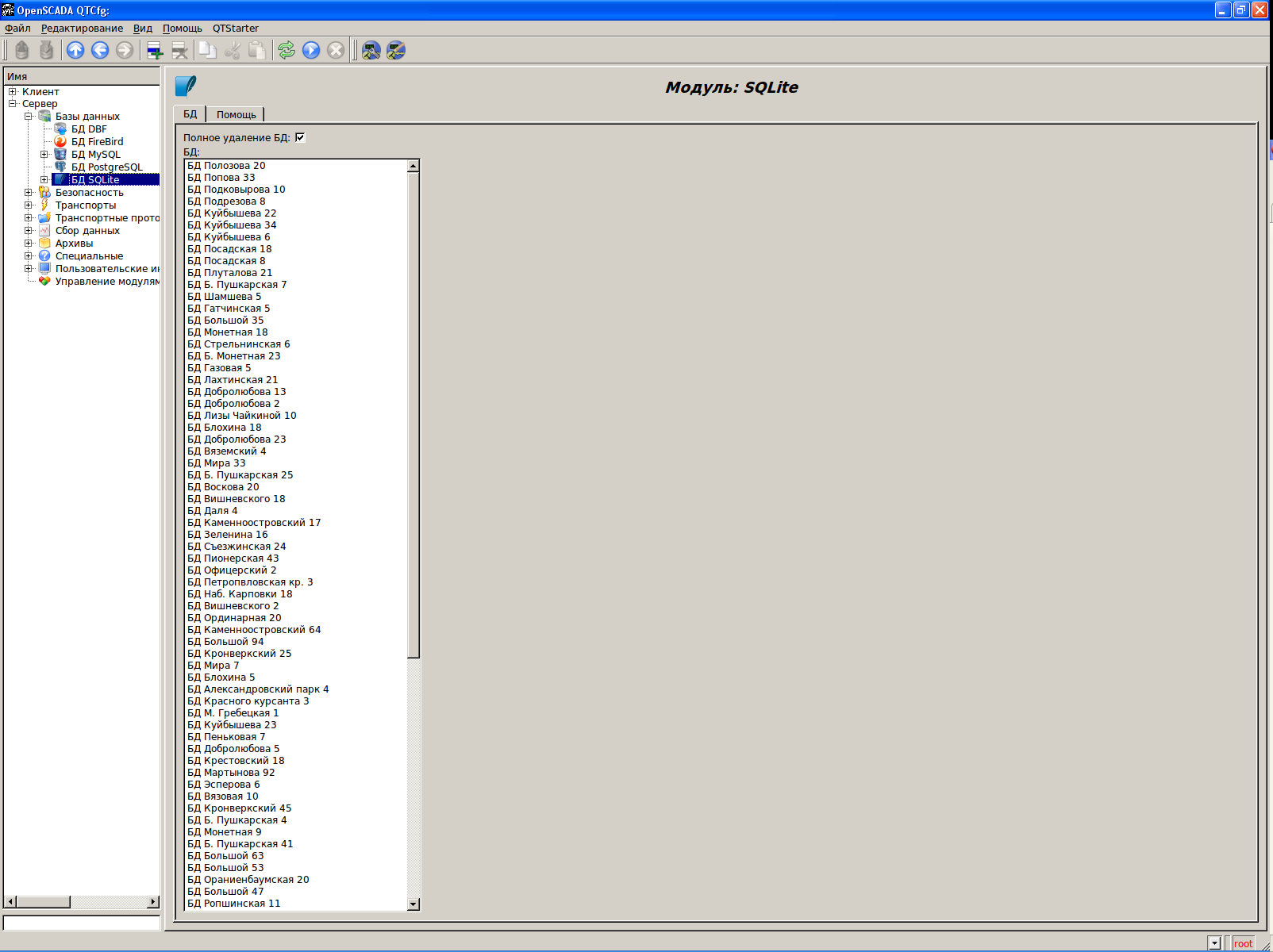 Каждый модуль подсистемы "БД" предоставляет конфигурационную страницу с вкладкам "БД" и "Помощь". Вкладка "БД" (рис.4.1c) содержит список БД, зарегистрированных в модуле и флажок признака полного удаления БД при выполнении команды удаления.