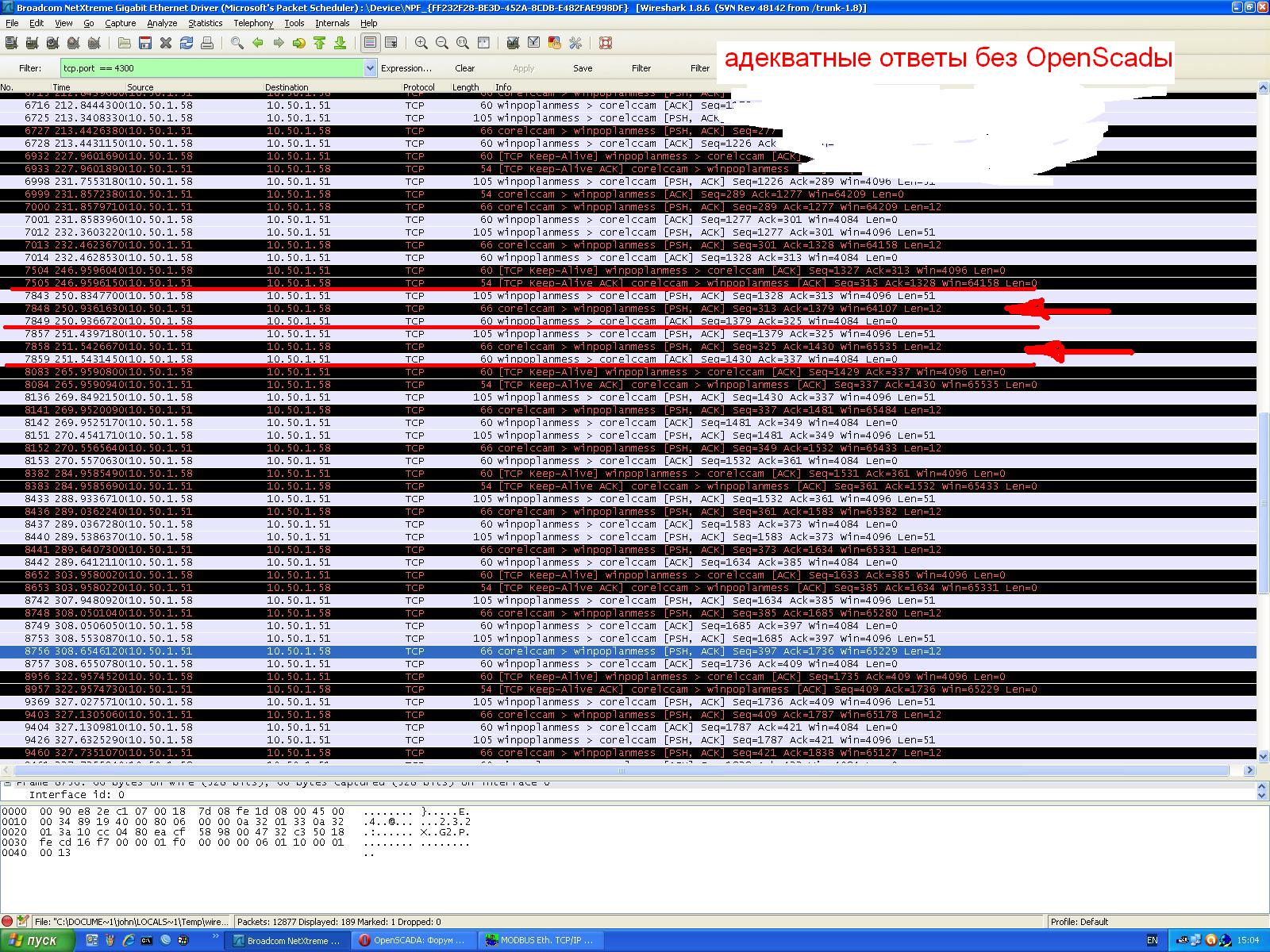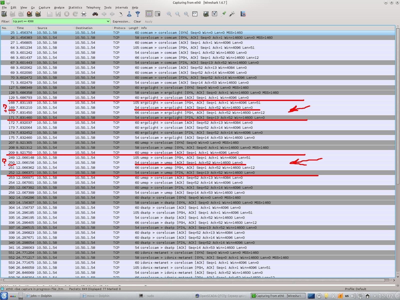 На скринах видно, что пересылка пакетов отличается., а именно на Виндовой машине сразу после отправки TCP пакета контроллером (10.50.1.58) Modbus Server (10.50.1.51) пересылает сразу в ответ сообщение контроллеру. А вот когда Openscada общается с контроллером, она отправляет перед пакетом с данными какой-то технический ??? пакет. Не совсем понятно откуда ноги растут.
