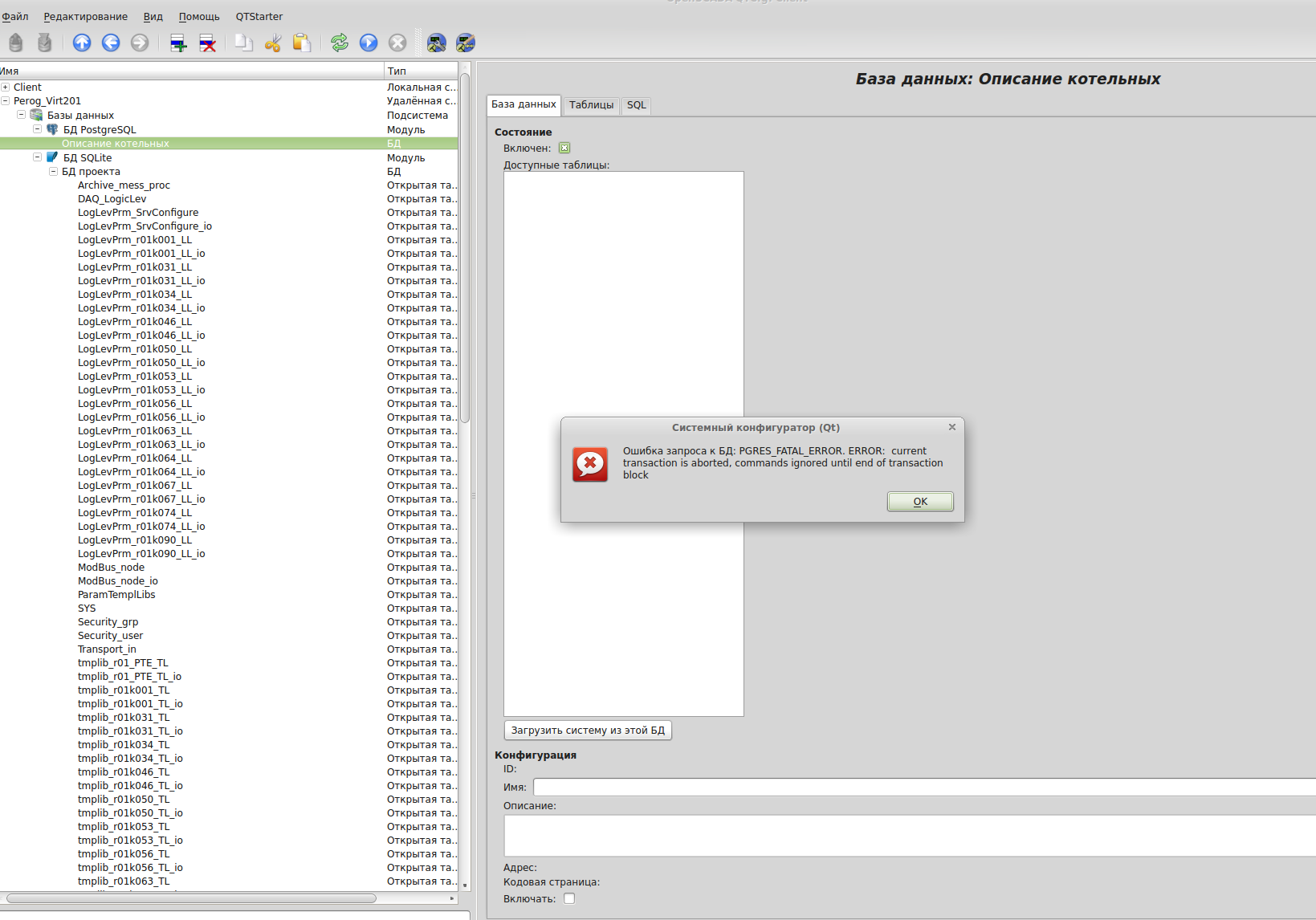 то OpenSCADA ни как не реагирует(не выдает ошибку соединения), она мне выдала ее только при заходе в узел "Postgresql.Базы данных"