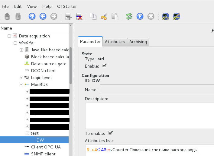 Имеется счетчик расхода жидкости, который позволяет получить текущие показания по протоколу Modbus RTU в формате UInt32 (два регистра Modbus). Для сбора данных с этого счетчика в разделе DAQ.Modbus создал соответствующий контроллер с параметром и единственным атрибутом:
