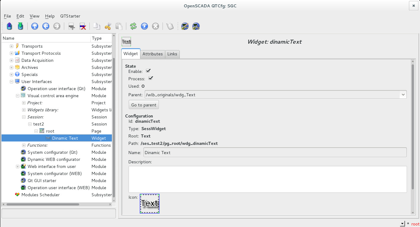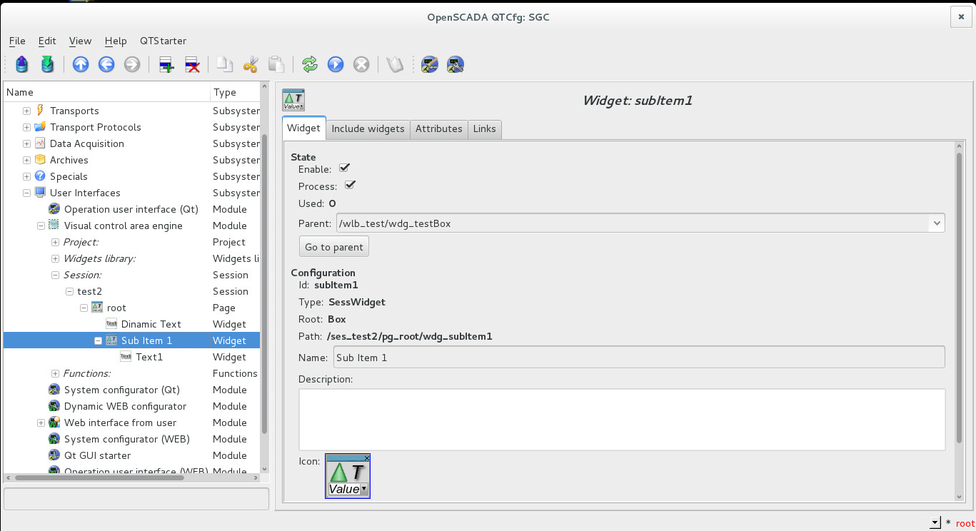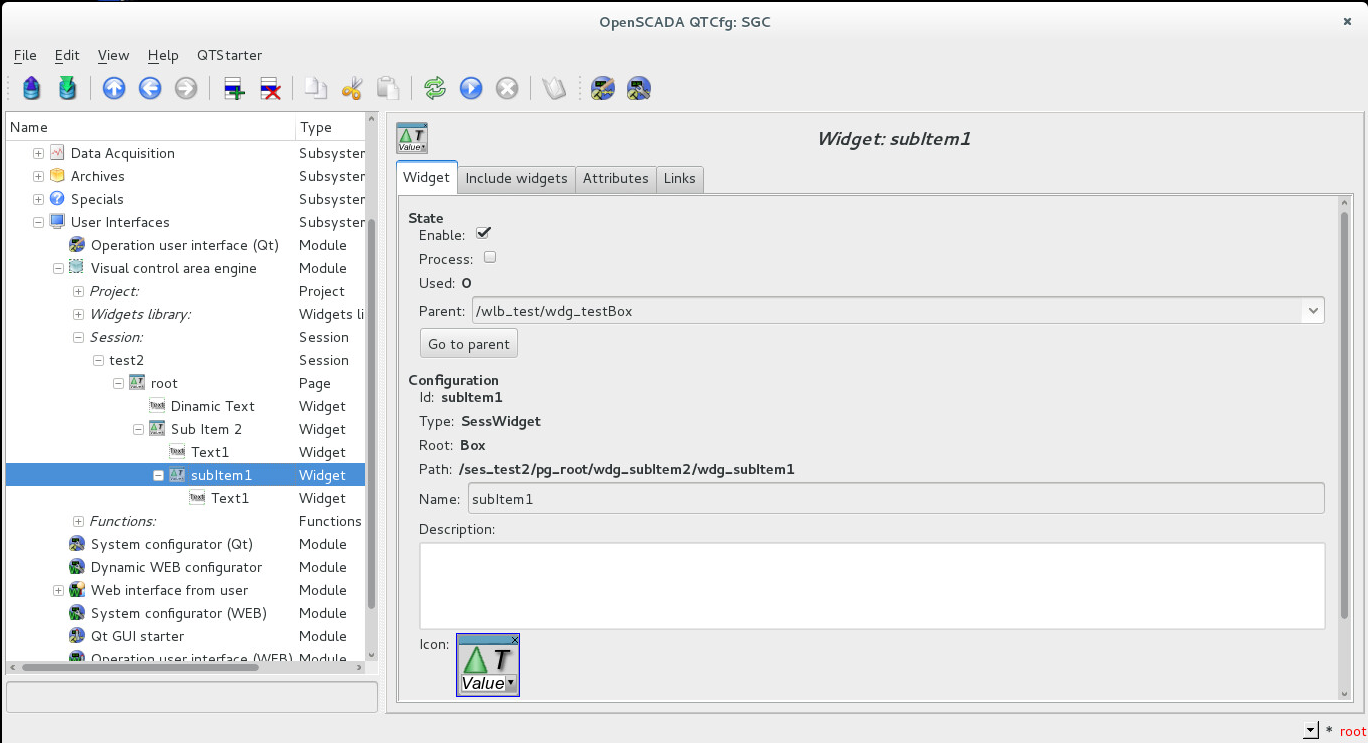 Проблема возникает если попробовать установить значение depth равным 2 или более. Вроде бы при этом должно создаться два элемента /wlb_test/wdg_testBox, при этом один элемент должен быть вложен в другой, но при запуске проекта этого не происходит. При запуске проекта на корневой странице создается первый дочерний элемент /wlb_test/wdg_testBox (смотри приложенный рисунок 4). А в системном конфигураторе в дереве сессий можно видеть, что дочерний объект был создан (смотри приложенный рисунок 5). Но почему то этот объект имеет не установленный флаг Process и часть его атрибутов не была задана скриптом, например Name. И еще одно - при закрытии окна с запущенным проектом визуализации сессия не закрывается и в конфигураторе системы можно видеть, что она продолжает работать и снять ее удается только закрытием всей OpenSCADA.
