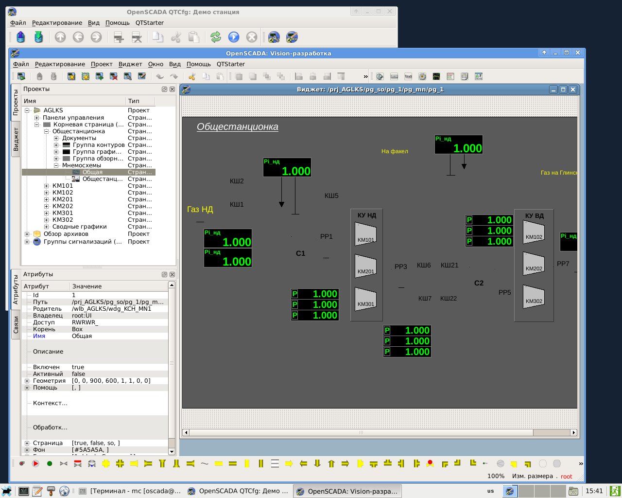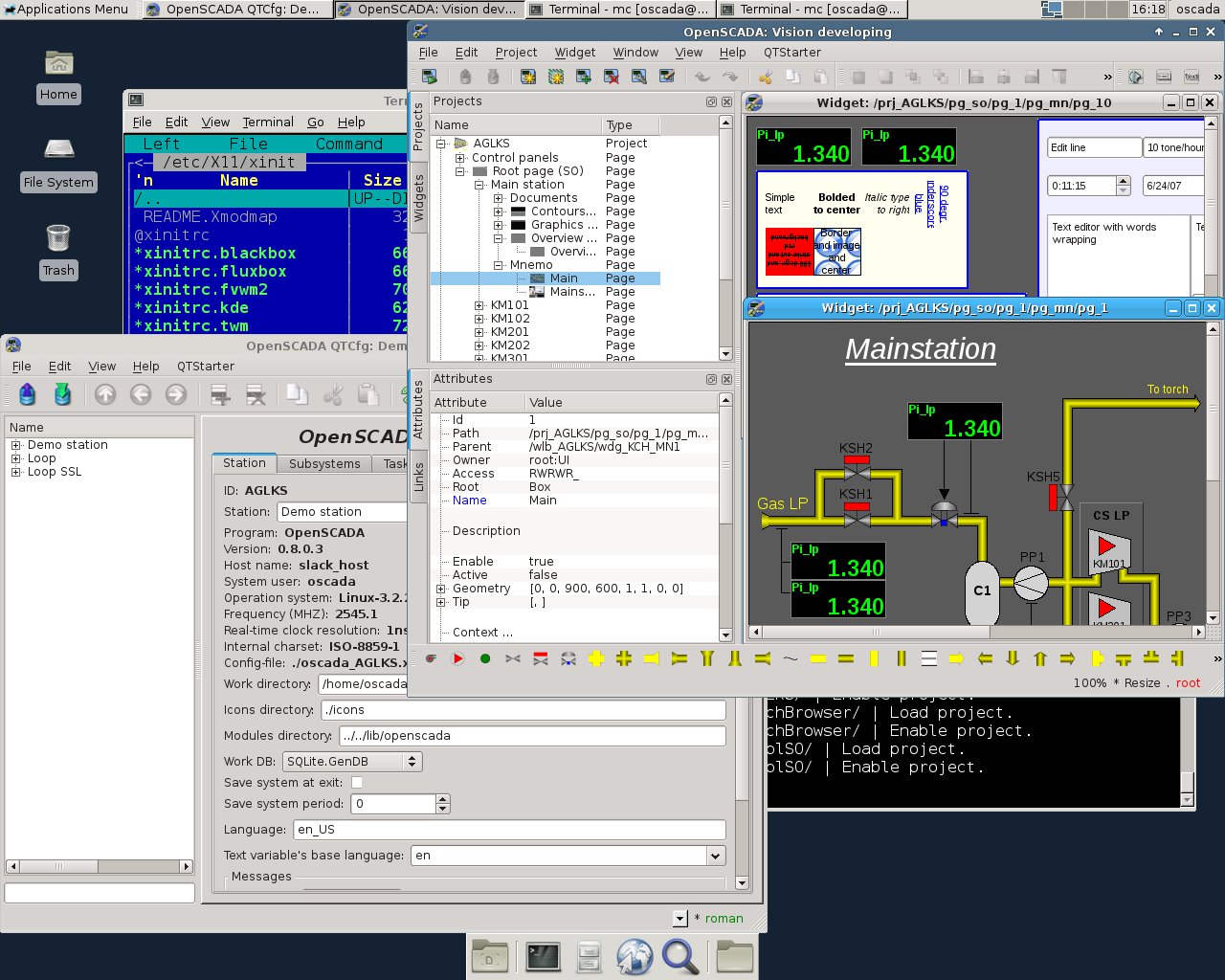 OpenScada 0.8.0.3 собрана из исходников (openscada-0.8.0.3.tar.lzma и openscada-res-0.8.0.3.tar.lzma). Собралось все кроме (PostgreSQL, FireBird, CoundCard и Comedi - для них нет собранных библиотек, да и надобности пока). Для SQLite пришлось добавить для LDFLAGS= '-ldl' (так посоветовал google). При компиляции неоднократно выскакивли warning: floating constant exeeds range double. Все установилось, запускается и работает(под xfce, kde что-то не стартует), но: