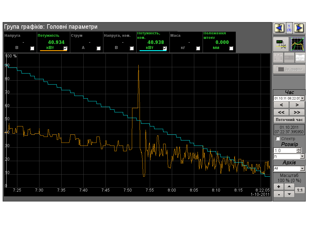 Отображаются два параметра: мощность фактическая и уставка. На интервале 10 часов (рисунок 1), выбирается абсолютная шкала, что отлично отображает ход процесса.