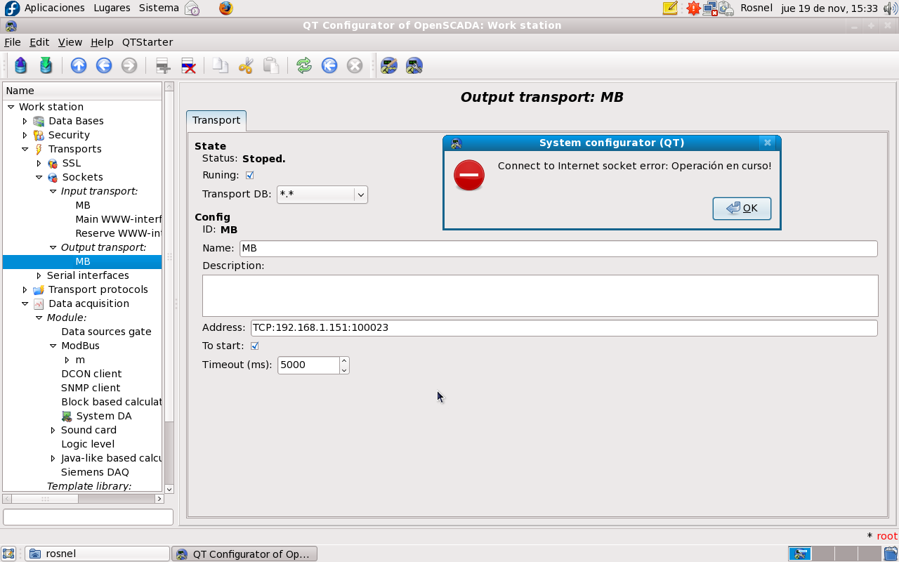 I'm trying to test the Modbus protocol, and when I connect a device and configure the "socket" for input and output module "trasports" failed to establish communication. I do this and then run a "Data Acquisition" module "modbus" using the TCP / IP using the "socket" previously configured.