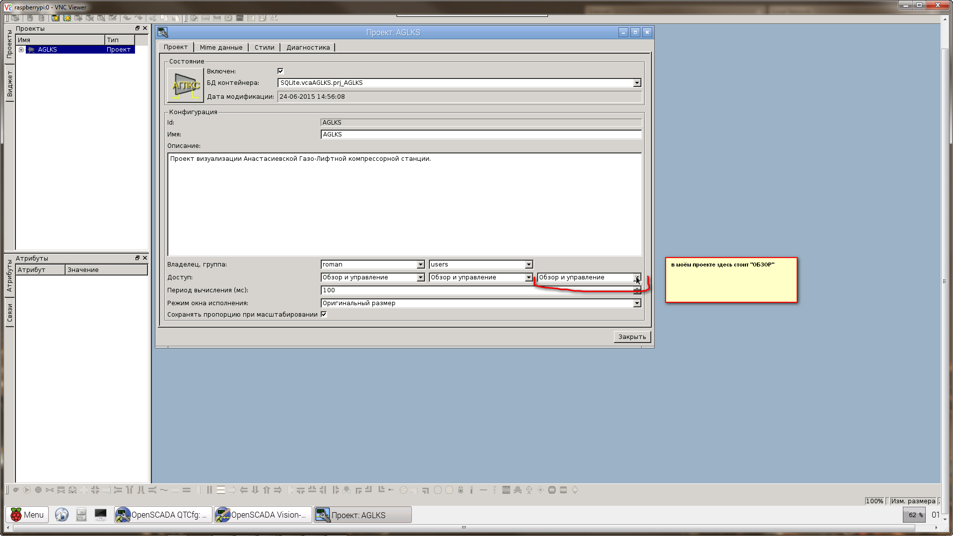Повторил ситуацию на проекте AGLKS. Отличие между моим проектом и AGLKS заключается в том, что в свойствах проекта визуализации (Vision) 3-я группа на доступ (догадываюсь что по аналогии с Linux это группа=остальные) в проекте AGLKS стоит "Обзор и управление", а у меня в проекте "Обзор" (см. прилагаемый рисунок). Теперь если я в своём проекте выставляю "Обзор и управление" то у меня под пользователя root web vision работает с доступом к управлению. Теперь в проекте AGLKS ставлю 3-е поле "Обзор", захожу под root с паролем openscada и получаю элементы управления только "Обзор". Т. е. теперь начиная с версии 2287 (в моём случае) если из под web заходишь под учётной записью root то она вроде как и не root получается? У меня есть пользователь user который должен иметь только ОБЗОР и он не входит в группу UI. Если я в 3-е поле выставляю "Обзор и управление" то он получает доступ на управление, чего не должно быть.