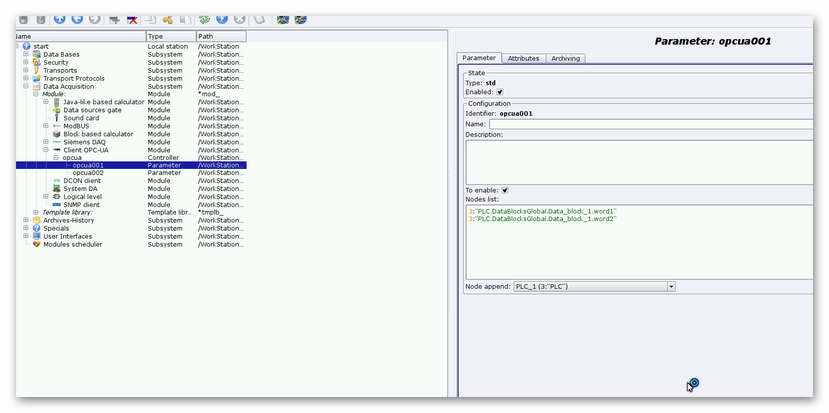 Зеленым подсвечены узлы, которые OpenScada видит, красным, которые не видит, остальные (без подсвечивания) не смотрел, интересует только ветка PLC_1. Видимость узлов проверяю вкладке <Server nodes browser> см. вложение 002.png