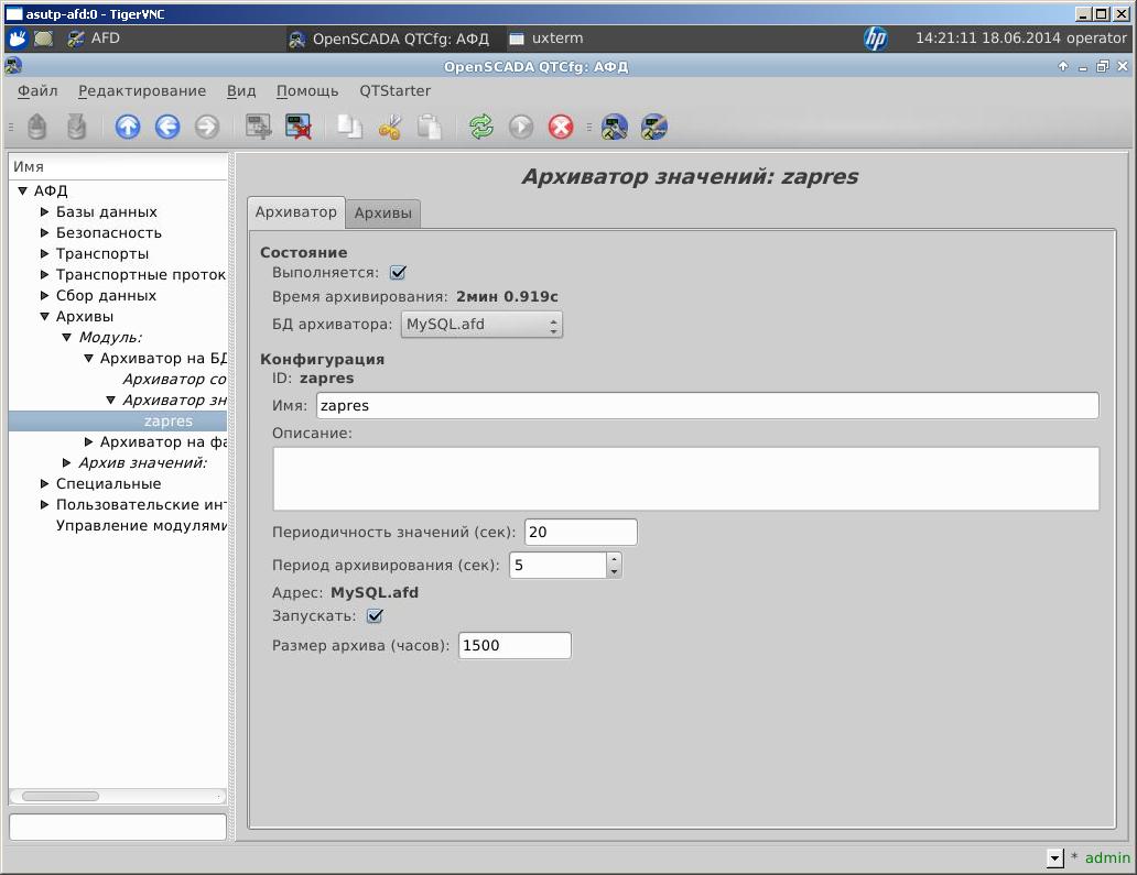 В настройках АРХИВАТОРа ЗНАЧЕНИЙ указал следующее: периодичность значений-10 сек., период архивирования-60 сек. Все заработало, но с периодичностью около минуты OpenSCADA делает вид, что "повисла": не реагирует на нажатие кнопок, не меняется изображение на мониторе и т.д.