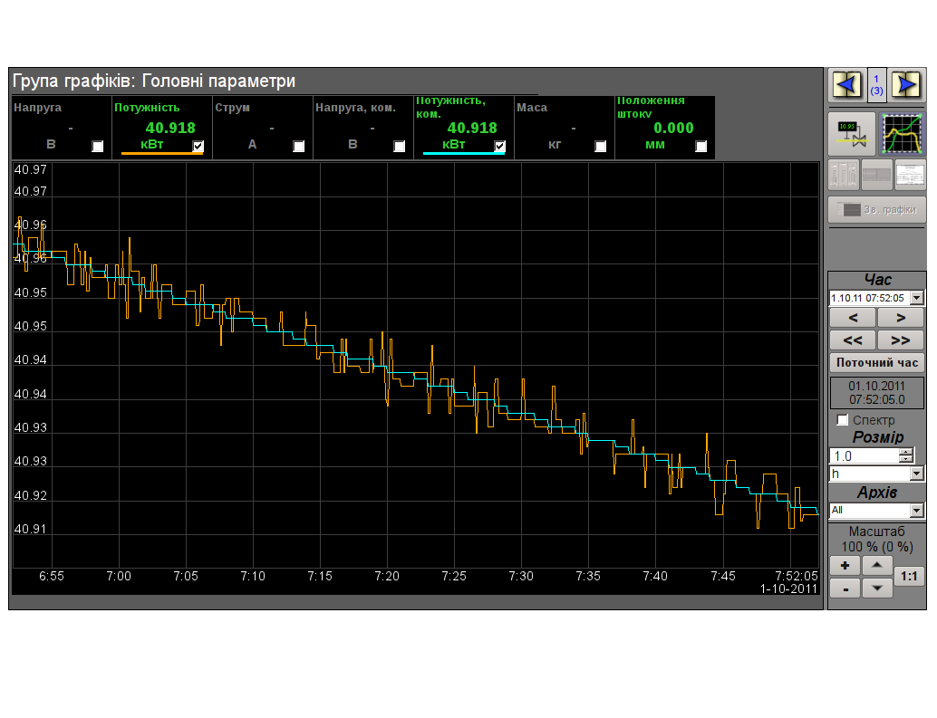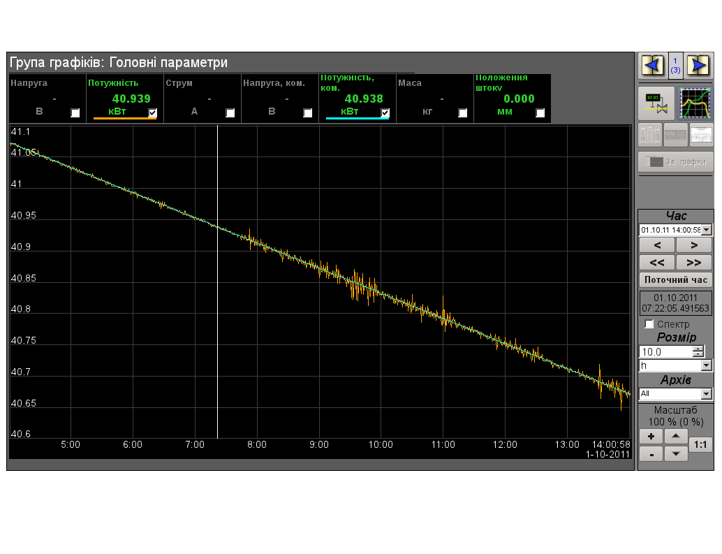 Отображаются два параметра: мощность фактическая и уставка. На интервале 10 часов (рисунок 1), выбирается абсолютная шкала, что отлично отображает ход процесса.