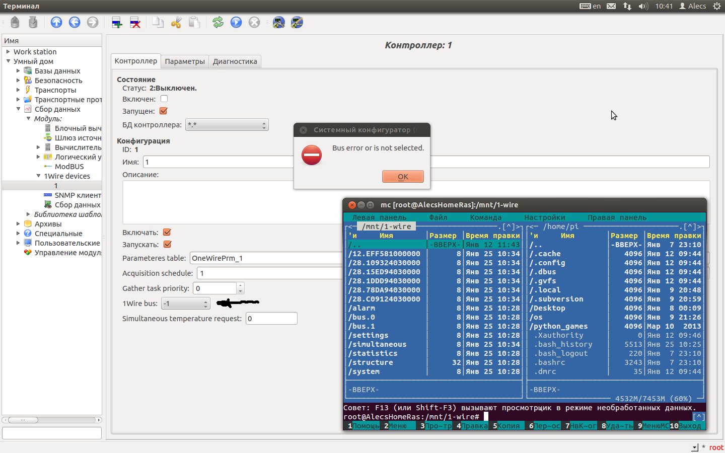 Команда с openscada не отрабатывается, только вручную с терминала. И не понятно почему не активен выбор (bus.-1) шины 1-wire. Понимаю телепаты отдыхают, но может наставите на путь истинный.