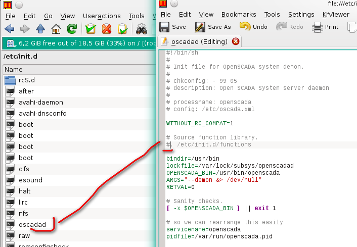 На Suse 13_2 поставил собранную вами сборку v2218. В режиме приложения работает. В режиме демона, нет. Не работает скрипт инициализации oscadad (в исходнике он как oscada_RH.init). Как обычно прописал в автозагрузку его находясь в директории /etc/init.d/ так "insserv oscadad), далее в yast появляется возможность управлять демоном. Но при попытке запуска выкидывает ошибка в строке 14, а затем если строку заремить (#) то в строке 34. См. прилагаемые рисунки. В /etc/oscada.xml прописана рабочая конфигурация, но до неё запуск не доходит. В исходнике oscada_RH.init в строке 14 ссылка на несуществующую директорию.