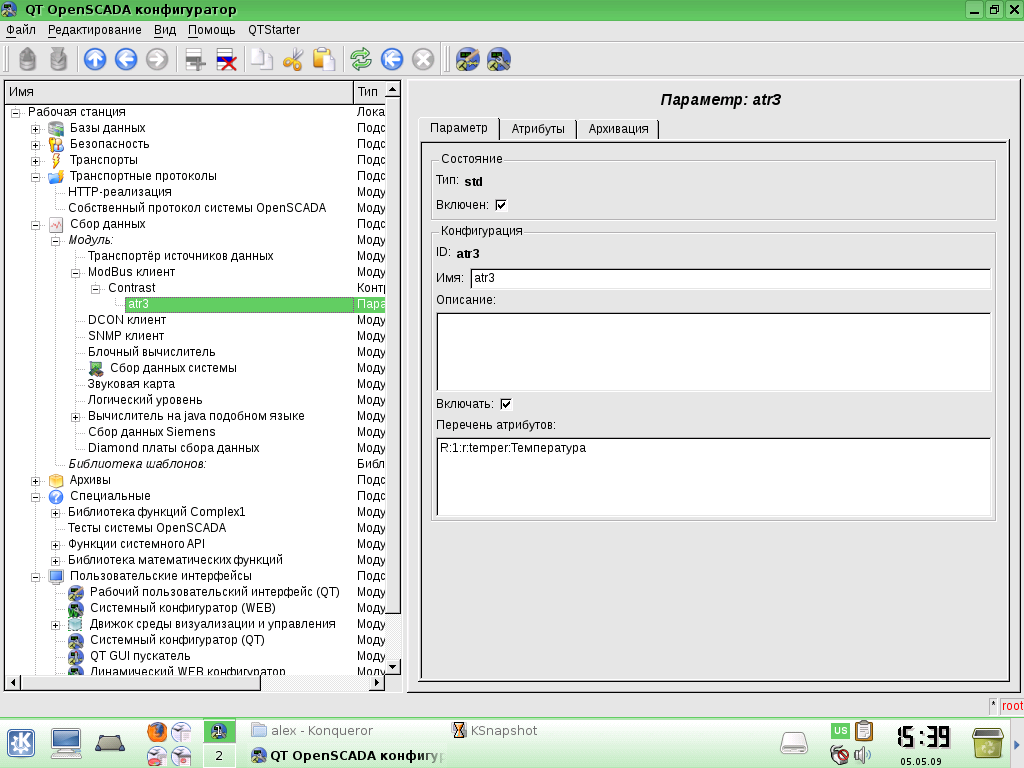 Здравствуйте! Помогите пожалуйста разобраться. Установил контроллер Контраст КР-500, связал его с OpenSCADA по ModBUS протоколу, прописал IP адрес контроллера, поставил галочку запущен - вроде работает. Как мне снять и отобразить хотябы один параметр с него,например у меня к контроллеру подключена термопара, хотелось бы отобразить её значение.