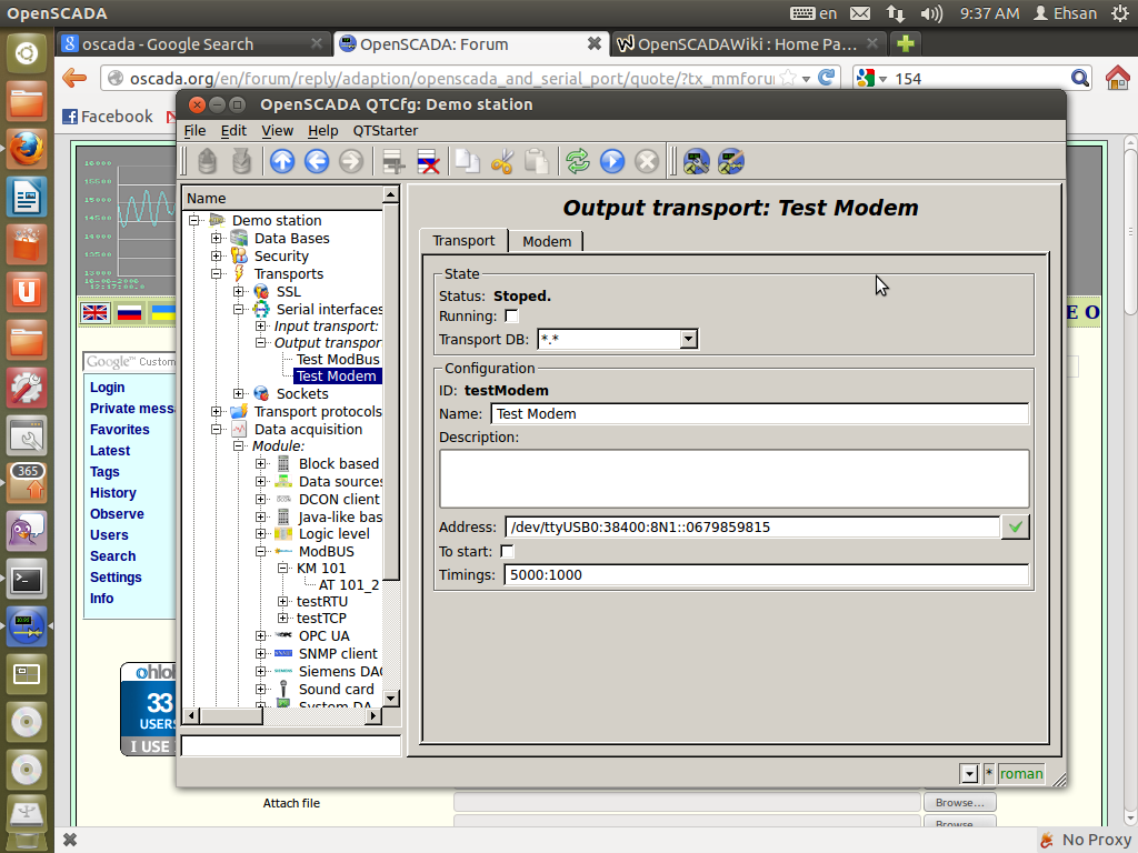 Other types transports created by like to "Sockets" method, but configuration typical different only at record format for address and timings. In case of transport module "Serial" into address field write the path to serial device, speed, and format. For converters USB->Serial that address you need learn into operation system, for example by console command "$ dmesg", just after the converter connection.