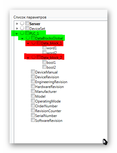 Зеленым подсвечены узлы, которые OpenScada видит, красным, которые не видит, остальные (без подсвечивания) не смотрел, интересует только ветка PLC_1. Видимость узлов проверяю вкладке <Server nodes browser> см. вложение 002.png