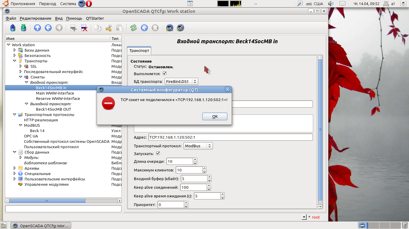 Пытаюсь привязать СХ9000 к OpenSCADA по ModBUS/TCP . Виндовая ModBUS Poll все видит отвечает и пишет, OpenSCADA пишет TCP сокет не подключился.