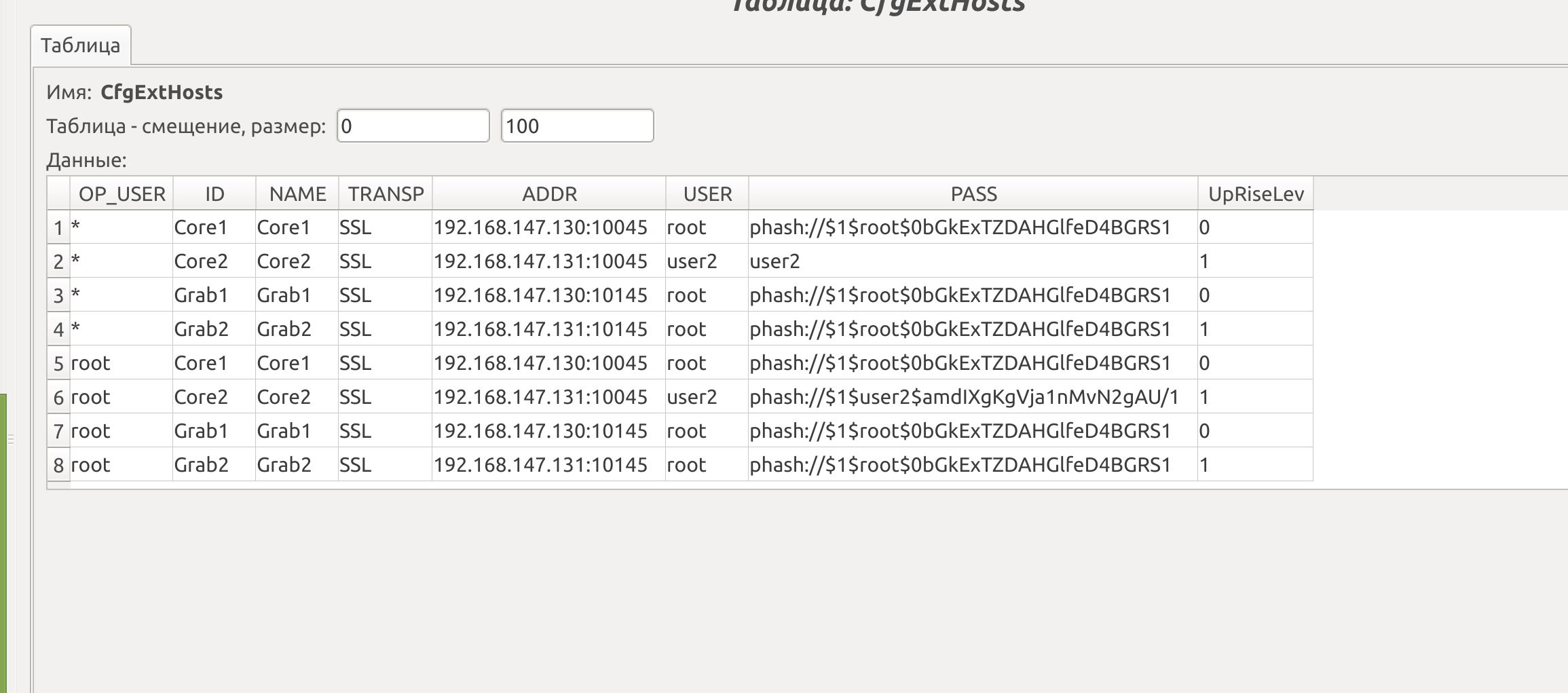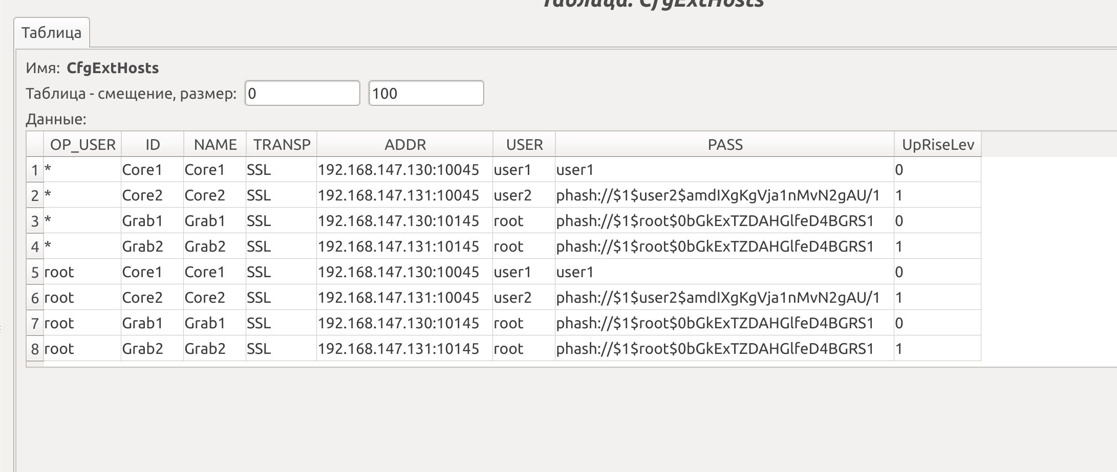 На скриншотах изменения пользователя root на пользователей user1 и user2. Начальная конфигурация, когда все пользователи root и везде указан хэш получена прямым редактированием БД