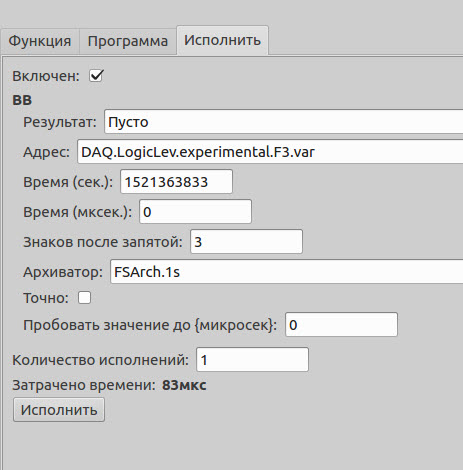 во вкладке "Исполнить" - ввожу в адрес - "DAQ.LogicLev.experiment.F3.var", в поле "архиватор" - "FSArch.1s", в поле "время" - вводил текущее время юникс в сек. После нажатия кнопки "исполнить" - результат всегда "пусто", хотя значение переменной на момент, когда это пишу - 45.0913.