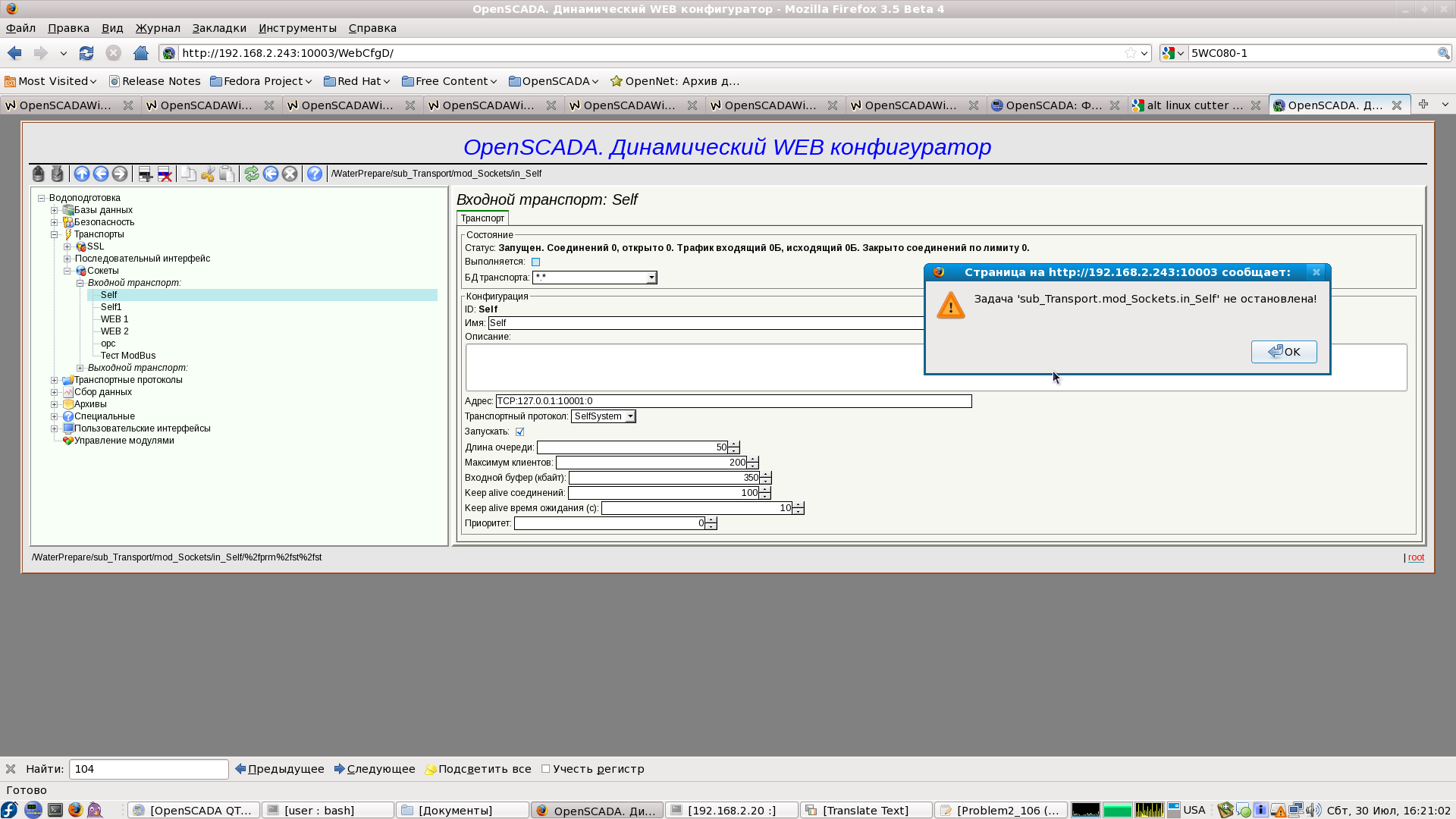 Собственно с изменением механизма создания задач в OpenSCADA возможны подобные проблемы, особенно на отключаемых задачах, которые и используются во входящих транспортах. Это связано с коллизией при регистрации новой задачи, в то время как старая с таким же идентификатором входящего-клиентского сокета ещё находится на стадии удаления.
