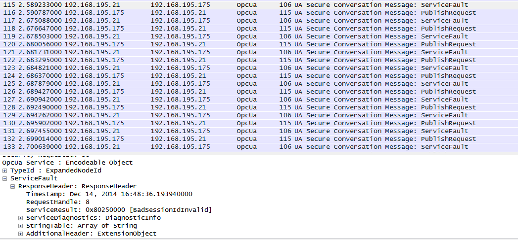 Такую ошибку встречал и ранее, однако дамп Wireshark сделал только сейчас. Но с замечанием, что в дампе присутствует и пакеты другого клиента(Genesis64), работающего параллельно с подключаемым UAExpert на тот же же сервер.