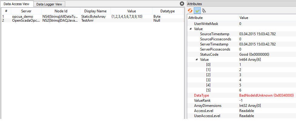 Сборка 2240, в UAExpert данные в Data View не отображаются. Ошибка типа данных BadNodeIdUnknown. И она совпадает с ошибкой из более раннего скриншота. Я про эти ошибки указывал.