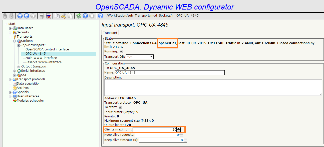 Клиент OPC UA не смог подключиться к OPC UA серверу на основе OpenSCADA и на WEB интерфейсе сервера проверил количество открытых соединений. Их оказалось 21. Что видно на скриншоте.