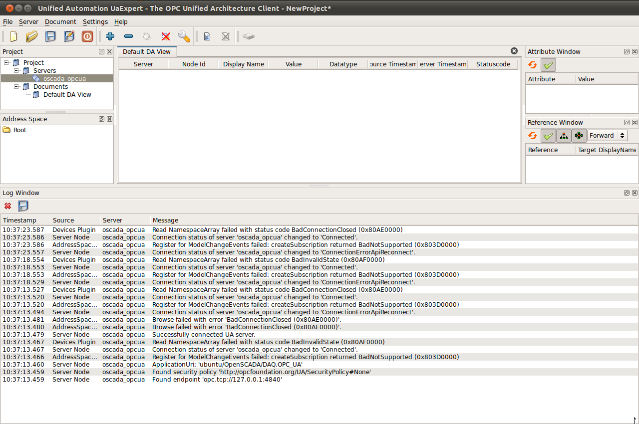 не могли бы вы выложить скриншот UaExpert'a подключенного к OPC UA серверу OpenSCADA, где были бы видны окна лога, Address Sapce и Attribute Window
